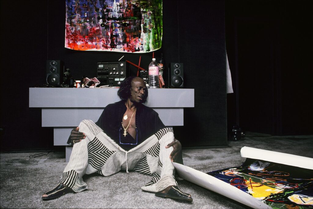‘86年6月,眼下にメトロポリタン美術館を見下ろす,マンハッタン5番街の高級アパート。広大な部屋を気ままに歩きまわるマイルスの後を,僕はちょろちょろと追いかけて撮りまくった。次々と絵を見せては振り向いて「どうだ?」の顔が得意満面だ。電話が鳴って受話器を上げている間,キッチンでオート・ミールをすすっている時,ワードローブやベッド,トイレの中まで入って写真を撮ったが,やめろとは言わなかった。